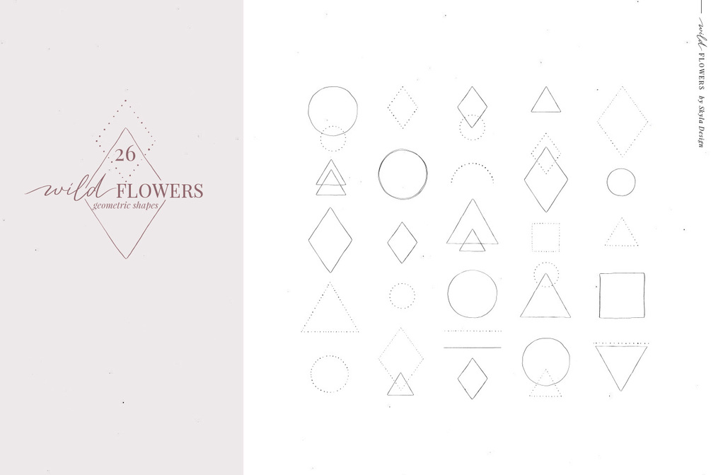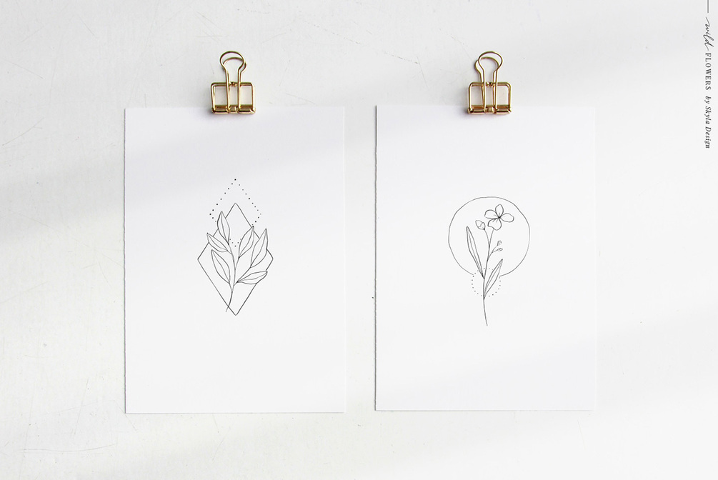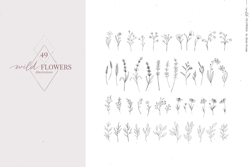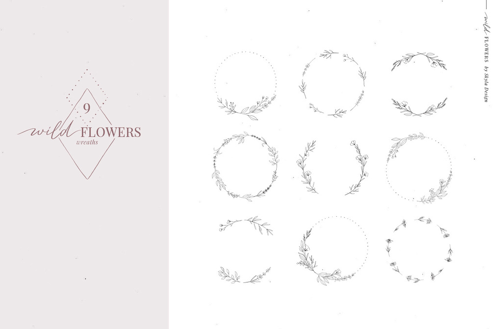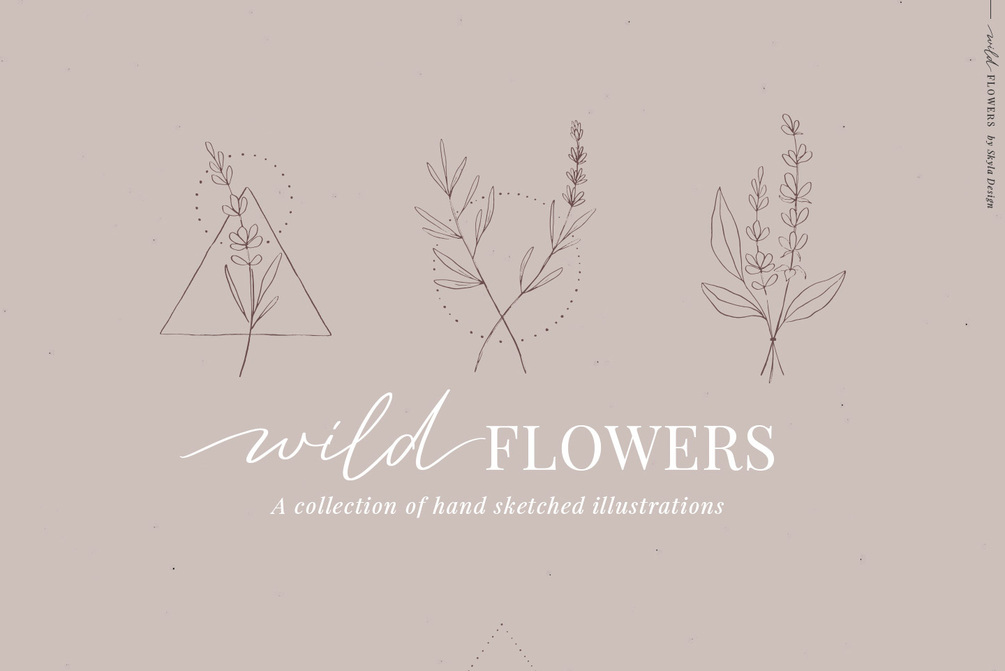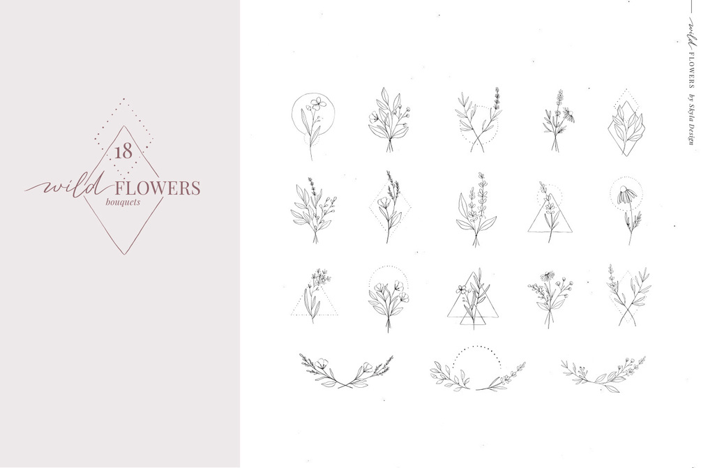 Imagine a field of wild flowers as far as the eye can see. Blue forget-me-nots, tiny white baby's breath and buttercups in full bloom and the scent of lavender in the air. This inspired the 'Wild Flower' collection which includes hand sketched floral illustrations, bouquets with geometric shapes, delicate wreaths & seamless patterns.